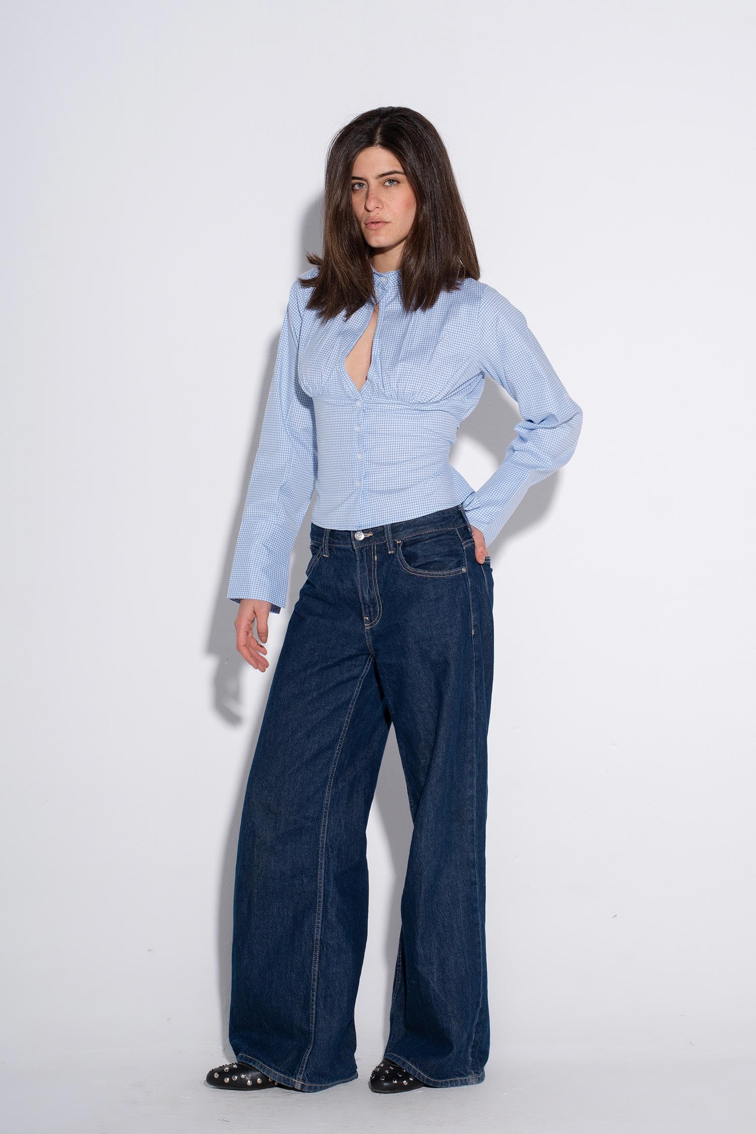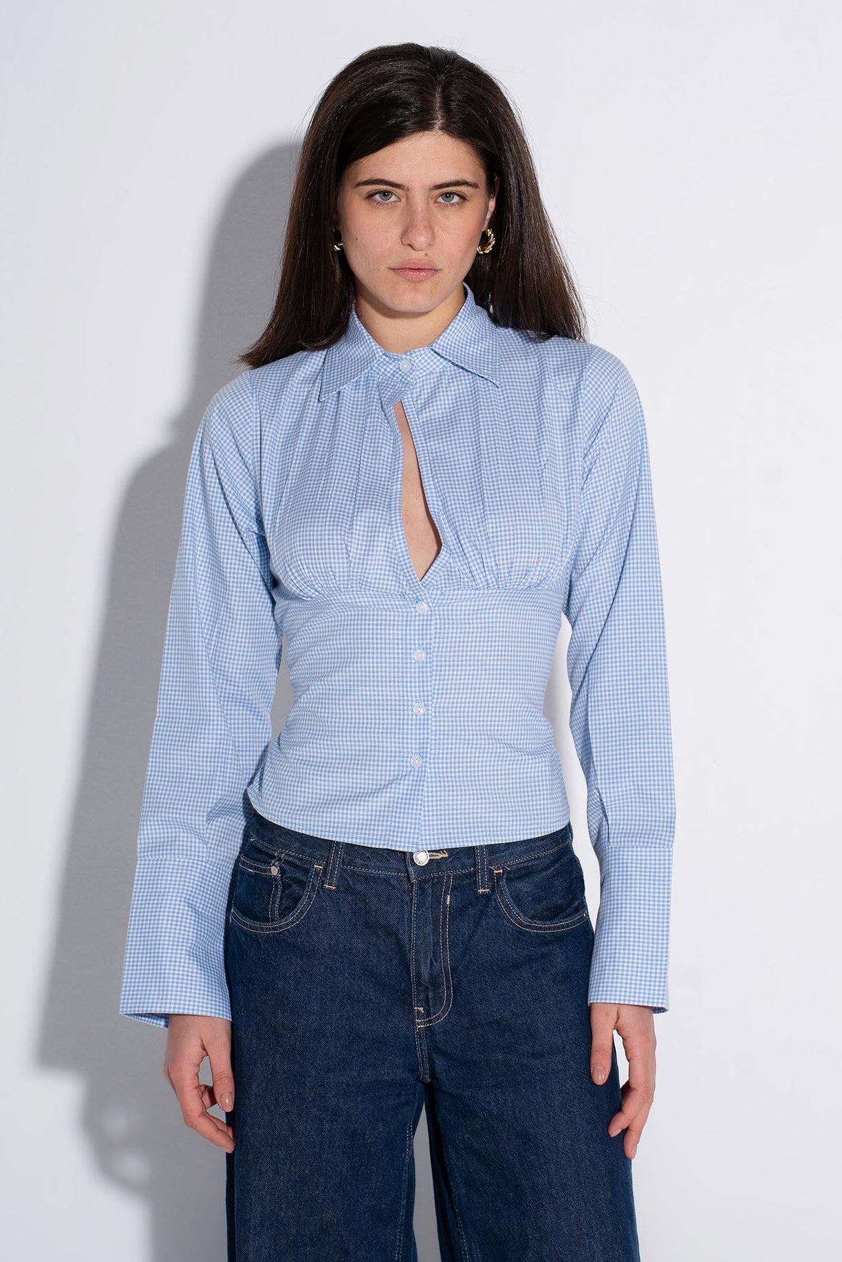 Crisp micro-check button shirt in light blue, designed for effortless everyday style. The refined check pattern brings subtle sophistication to your wardrobe, while the button-front closure offers easy layering versatility. Crafted from soft, breathable fabric that moves with you throughout the day—ideal for casual wear or smart-casual occasions.